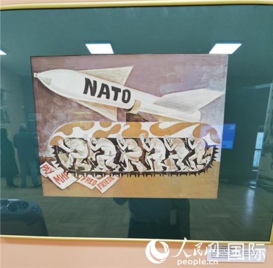 现场展出的讽刺北约漫画。人民网记者 荣翌摄