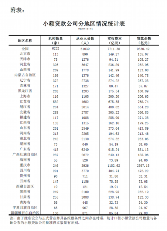 据中国人民银行,截至2022年3月末,全国共有小额贷款公司6232家。贷款余额9330亿元,一季度减少85亿元。