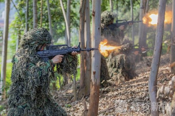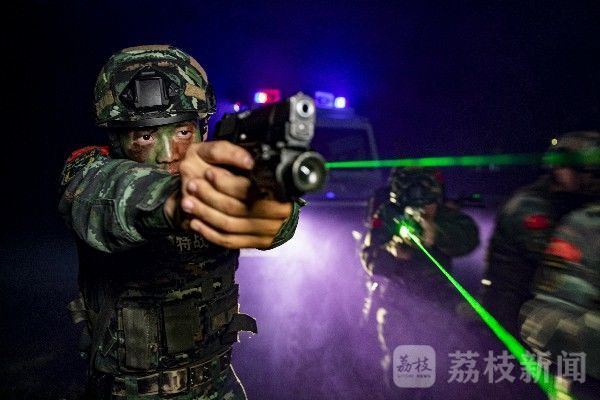 夜幕降临,各组队员默契配合,将目标围困在一个山坳。一声令下,战斗打响。各战斗小组利用爆震弹和火力掩护,多点攻击,一举将“敌”歼灭。