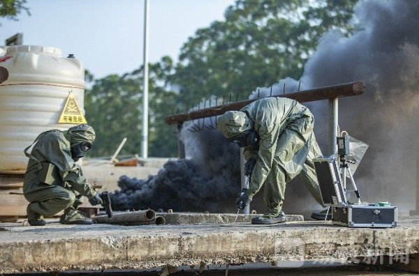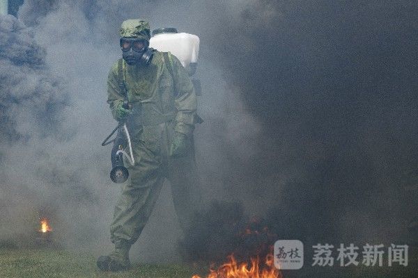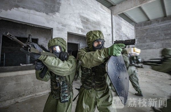 官兵迅速穿戴防化服,随后采取灵活战术抵近目标,完成突击任务。