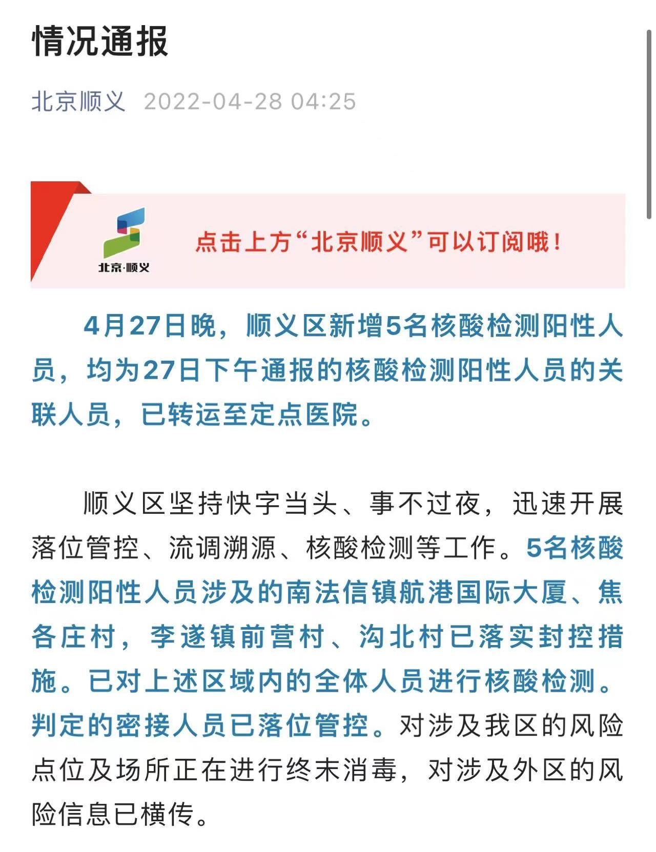 荔枝新闻讯 据“北京顺义”微信公众号消息,4月27日晚,北京市顺义区新增5名核酸检测阳性人员,均为27日下午通报的核酸检测阳性人员的关联人员,已转运至定点医院。