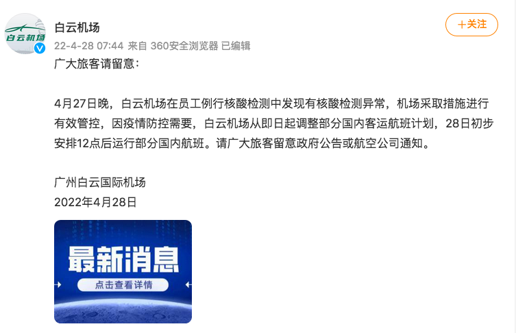 荔枝新闻讯 据白云机场微博消息,4月27日晚,白云机场在员工例行核酸检测中发现有核酸检测异常,机场采取措施进行有效管控,因疫情防控需要,白云机场从即日起调整部分国内客运航班计划,28日初步安排12点后运行部分国内航班。请广大旅客留意政府公告或航空公司通知。