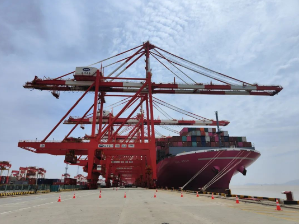 洋山4期自动化码头,这是全球规模最大的自动化集装箱码头。码头旁,自动化装卸设备正把集装箱装上一艘大型远洋货船。