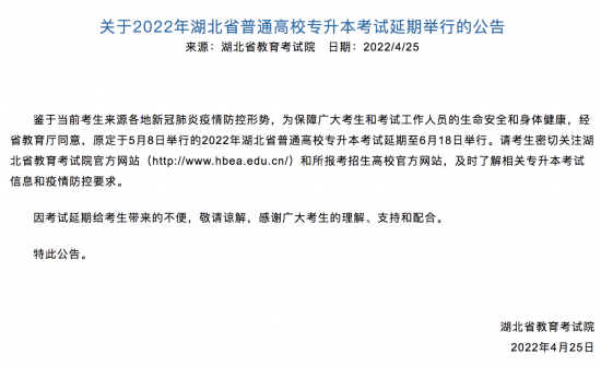 4月25日,湖北省教育考试院也发布《关于2022年湖北省普通高校专升本考试延期举行的公告》:原定于5月8日举行的2022年湖北省普通高校专升本考试延期至6月18日举行。