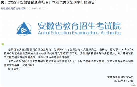 近日,多地疫情引发关注。据安徽省教育招生考试院消息,该省普通高校专升本考试再次延期举行: