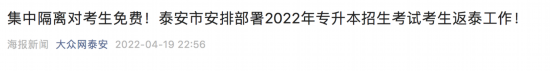 《泰安市2022年普通高等教育专科升本科招生考试考生返泰通知》中明确: