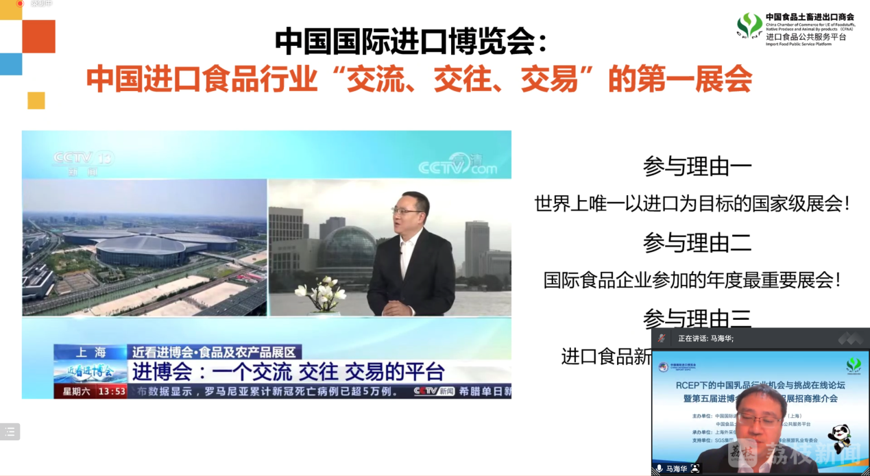 4月27日下午,第五届进博会食品展区招展招商推介会暨RCEP下的中国乳品行业机会与挑战在线论坛成功举办。