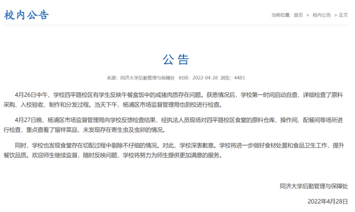 4月26日中午,学校四平路校区有学生反映午餐盒饭中的咸猪肉质存在问题。获悉情况后,学校第一时间启动自查,详细检查了原料采购、入校验收、制作和分发过程。当天下午,杨浦区市场监督管理局也到校进行检查。