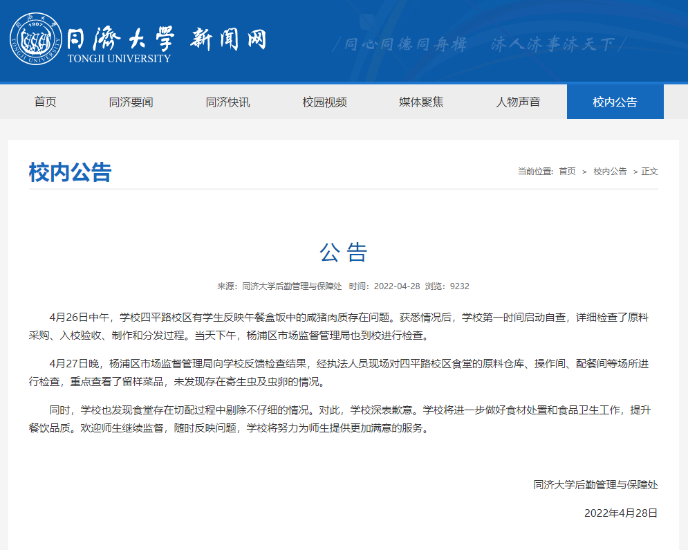 荔枝新闻讯 同济大学新闻网28日发布公告,4月26日中午,学校四平路校区有学生反映午餐盒饭中的咸猪肉质存在问题。获悉情况后,学校第一时间启动自查,详细检查了原料采购、入校验收、制作和分发过程。当天下午,杨浦区市场监督管理局也到校进行检查。