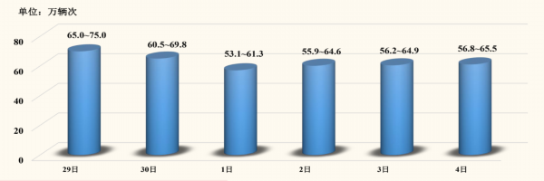 五一期间,受疫情形势复杂等影响,公众出行需求受到严重抑制,预计日均出口流量较去年同期下降明显,全省高速公路日均出口流量仅为56.5~65.2万辆次,同期下降85%左右,较2021年日均出口流量下降约75%,较2022年清明(日均流量为43.47万辆次)增长约40%。