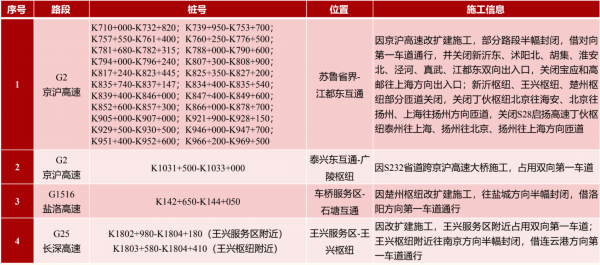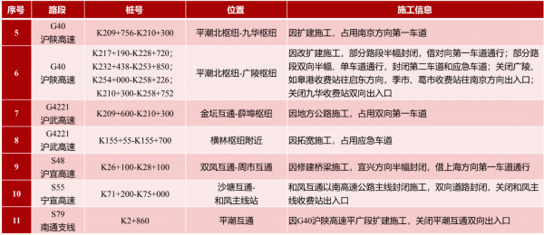 五一期间,省内有G2京沪高速、G40沪陕高速等11处高速公路施工路段、节点,请注意现场交通标志提示!