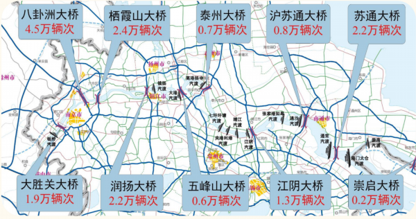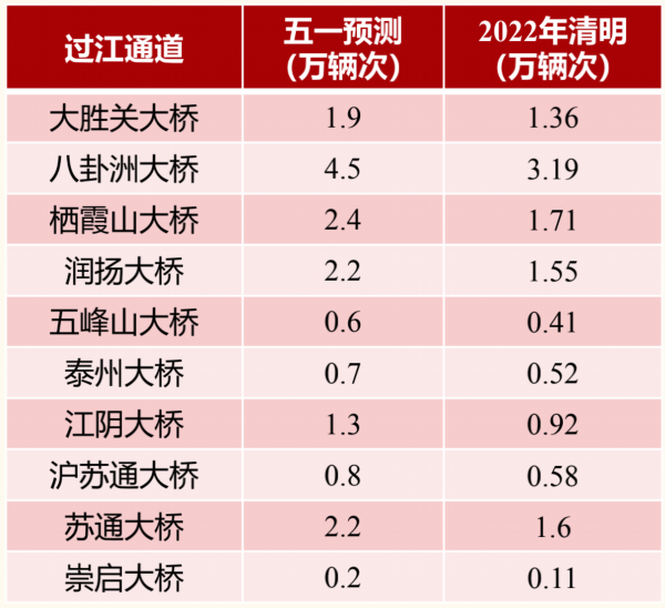 五一期间,受疫情影响,全省10座高速公路过江通道流量都不大,过江通道总体日均流量预计为16.7万辆次/日,同比下降82%左右,较2022年清明增长约40%。