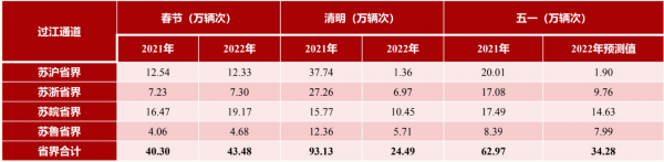 五一期间,受疫情形势影响,全省高速公路省界通道流量不高,预计通道总流量达到34.3万辆次/日左右,较去年同期下降45%左右,较2022年清明节增长约40%。其中,受上海疫情形势非常严峻影响,预计苏沪省界流量最低,仅为1.9万辆次。
