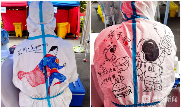 近日,在吴中区太湖街道新城郡未来小区的核酸检测现场,一些“大白”和“小蓝”身披手绘“战袍”,坚守在抗疫防疫的前线,吸引了不少居民的目光。