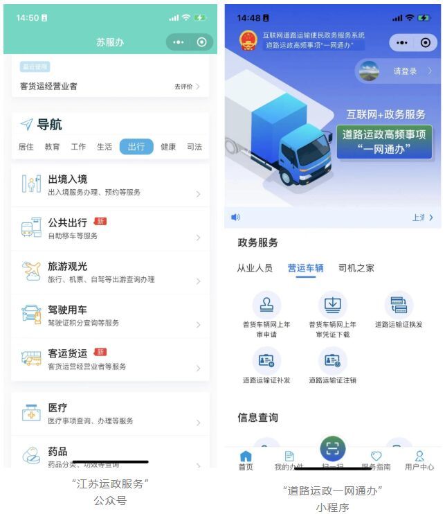 ④道路运输证年审:“江苏运政服务”公众号-业务办理、“道路运政一网通办”小程序-政务服务。