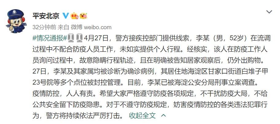 荔枝新闻讯 “平安北京”微博消息,4月27日,警方接疾控部门提供线索,李某(男,52岁)在流调过程中不配合防疫人员工作,未如实提供个人行程。经核实,该人在防疫工作人员询问过程中,故意隐瞒行程轨迹,且在明确被告知居家观察后,仍外出购物。27日,李某及其家属均被诊断为确诊病例,其居住地海淀区甘家口街道白堆子甲23号院等多个点位被封控管理。目前,李某已被海淀公安分局刑事立案调查。