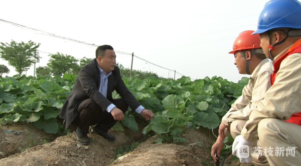 4月26日下午,江苏丰县范楼镇牛蒡标准化种植基地负责人曹修春正在向前来征求用电需求的国网丰县供电公司工作人员介绍发展计划。曹修春说,“我们公司在周边流转3000亩土地,种植牛蒡2000亩,这些牛蒡都充分得到了灌溉,灌溉的好处一是提高牛蒡的产量, 二是提升牛蒡的品质。”供电部门专门为其架设了电力线路,目前基地灌溉得到了很好的保证。
