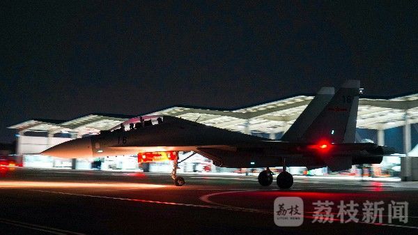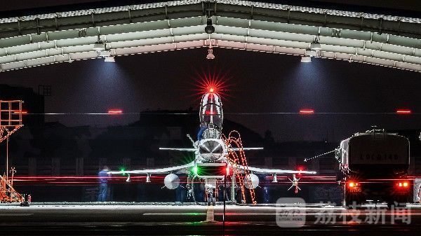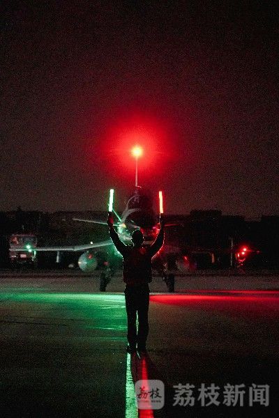 近日凌晨,东部战区海军航空兵某旅机场灯光闪烁、战机轰鸣。随着一发绿色信号弹划破夜空,数架战鹰拖着淡蓝色的尾焰划破夜幕、直刺苍穹,奔赴预设空域开展下半夜飞行训练。