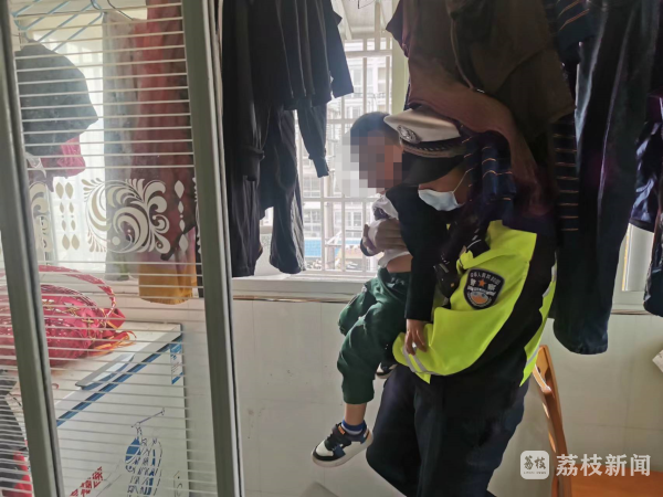 4月24日午间,南京市公安局江北新区分局交警支队第二大队警力在辖区巡逻时,突然听见有小孩的哭声传来。民警张文宇带着辅警李啸天和鲍子健赶忙寻找哭声来源,发现旁边一处居民楼内四楼的阳台上有一个正抓着防盗窗哭闹不止的男童。
