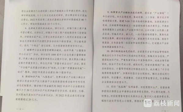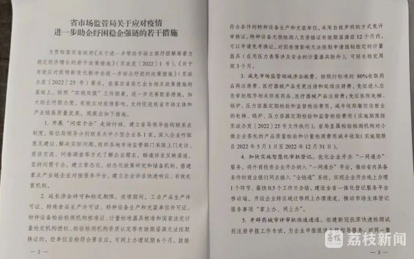 《若干措施》共12条,主要包括开展“问需于企”走访行动、延长涉企许可和检定期限、减免市场监管领域涉企收费、加快实施智慧化审批登记、开辟药械审评审批快速通道、支持城乡居民创业就业、破解中小企业质量管理难点堵点、推动知识产权“入园惠企”、加强重点产业链标准技术保障、推行轻微违法免罚轻罚、实行“包容期”信用监管、维护平稳有序市场秩序等方面内容,以具有针对性、可操作性的务实举措,有效应对疫情影响,支持促进江苏省市场主体和产业链高质量发展。