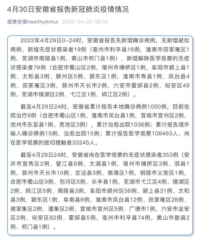 截至4月29日24时,安徽省累计报告本地确诊病例1050例,目前在院治疗8例(合肥市蜀山区1例,淮南市凤台县1例,宣城市宣州区2例,池州市东至县1例、贵池区3例),累计治愈出院1036例;累计报告境外输入确诊病例15例,治愈出院15例;累计报告医学观察108493人,尚在医学观察的密切接触者33245人。