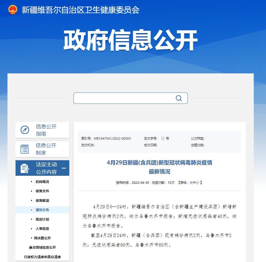 截至4月29日24时,新疆(含兵团)现有确诊病例2例,乌鲁木齐市2例;无症状感染者60例,乌鲁木齐市60例。