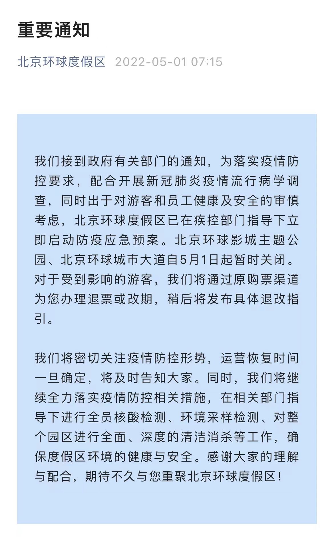 据北京环球度假区微信公众号消息:接到政府有关部门的通知,为落实疫情防控要求,配合开展新冠肺炎疫情流行病学调查,同时出于对游客和员工健康及安全的审慎考虑,北京环球度假区已在疾控部门指导下立即启动防疫应急预案。北京环球影城主题公园、北京环球城市大道自5月1日起暂时关闭。对于受到影响的游客,我们将通过原购票渠道为您办理退票或改期,稍后将发布具体退改指引。