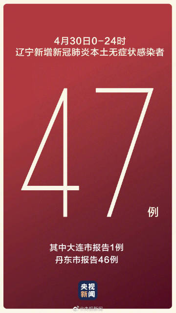 4月30日0-24时,辽宁省无新增新冠肺炎确诊病例;新增47例本土无症状感染者,其中大连市报告1例、丹东市报告46例;新增3例境外输入无症状感染者,其中沈阳市报告2例、大连市报告1例。解除医学观察本土无症状感染者16例。