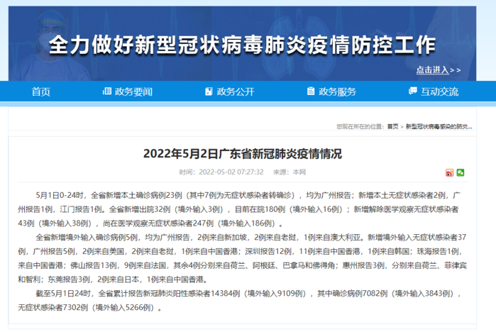 荔枝新闻讯 据广东省卫生健康委员会网站消息,5月1日0-24时,全省新增本土确诊病例23例(其中7例为无症状感染者转确诊),均为广州报告;新增本土无症状感染者2例,广州报告1例,江门报告1例。全省新增出院32例(境外输入3例),目前在院180例(境外输入16例);新增解除医学观察无症状感染者43例(境外输入38例),尚在医学观察无症状感染者247例(境外输入186例)。