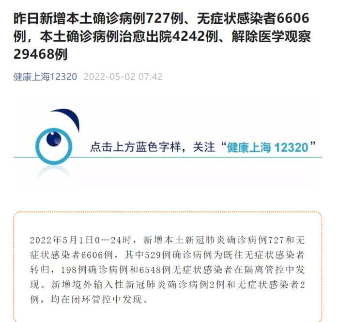 2022年5月1日0—24时,新增本土新冠肺炎确诊病例727例,含529例由既往无症状感染者转为确诊病例。新增治愈出院4242例。