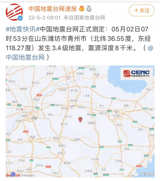 中国地震台网正式测定:05月02日07时53分在山东潍坊市青州市(北纬36.55度,东经118.27度)发生3.4级地震,震源深度8千米。