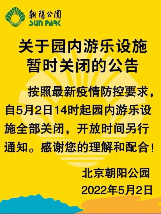 荔枝新闻讯 据北京朝阳公园消息,按照最新疫情防控要求,自5月2日14时起,园内游乐设施暂时关闭,开放时间另行通知。