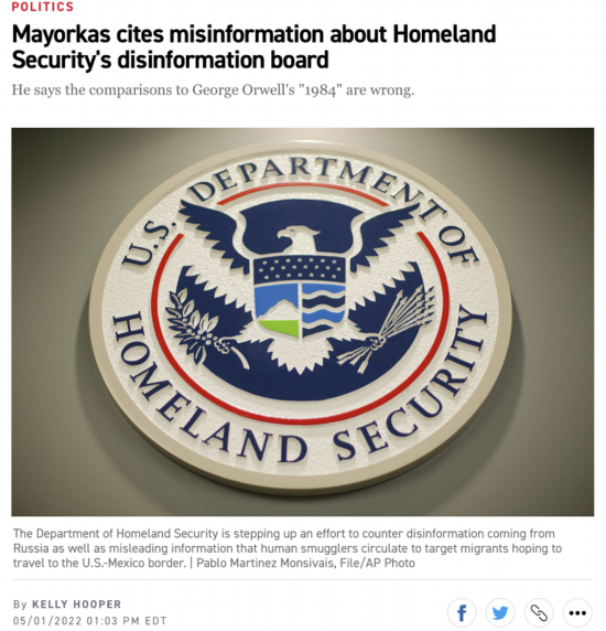 【环球网报道】拜登政府近日成立“虚假信息治理委员会”,被共和党人炮轰。美国“政治”新闻网站报道,美国国土安全部部长亚历杭德罗·马约卡斯5月1日为该部门下新成立的“虚假信息治理委员会”辩护,声称该组织不会侵犯美国公民的言论自由和隐私。马约卡斯的言论在网络上引发新一轮争议,有网友讽刺称,马约卡斯这话“似曾相识”。