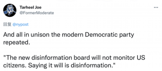 有人批评称,“如今的民主党异口同声地重复着这一切。(他们说)‘新的虚假信息治理委员会将不会监控美国公民。质疑这种说法的都是虚假消息’。”