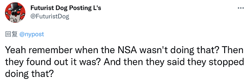 “嘿,还记得NSA当时也说不会这么做吗?后来他们被发现在这么做?然后他们说不会再这么做?”