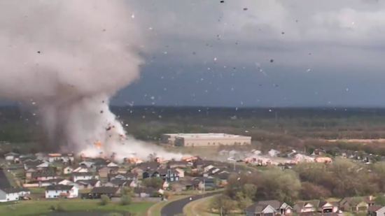 美国媒体公布的无人机视频显示,龙卷风破坏力惊人,摧毁了行进途中的建筑物,并将残骸卷到空中。