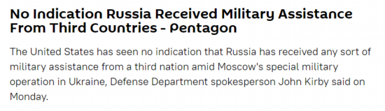 “我没有看到任何迹象表明他们(俄罗斯)从第三国获得了外部援助,”据报道,柯比当天在记者会上说,“我只是没有看到任何迹象表明他们正试图利用其他政府或国家的外部资源。”