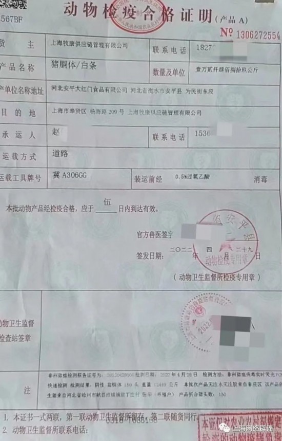 对此,青浦区金泽镇疫情防控工作领导小组办公室发出公告表示,经金泽镇市场监督管理所上门执法检查,网传视频涉及的每惠鲜超市所售猪肉系2022年4月30日采购自上海牧康供应链管理有限公司(动物检疫合格证明对应生产单位:河北安平大红门食品有限公司),签发日期为2022年4月29日。