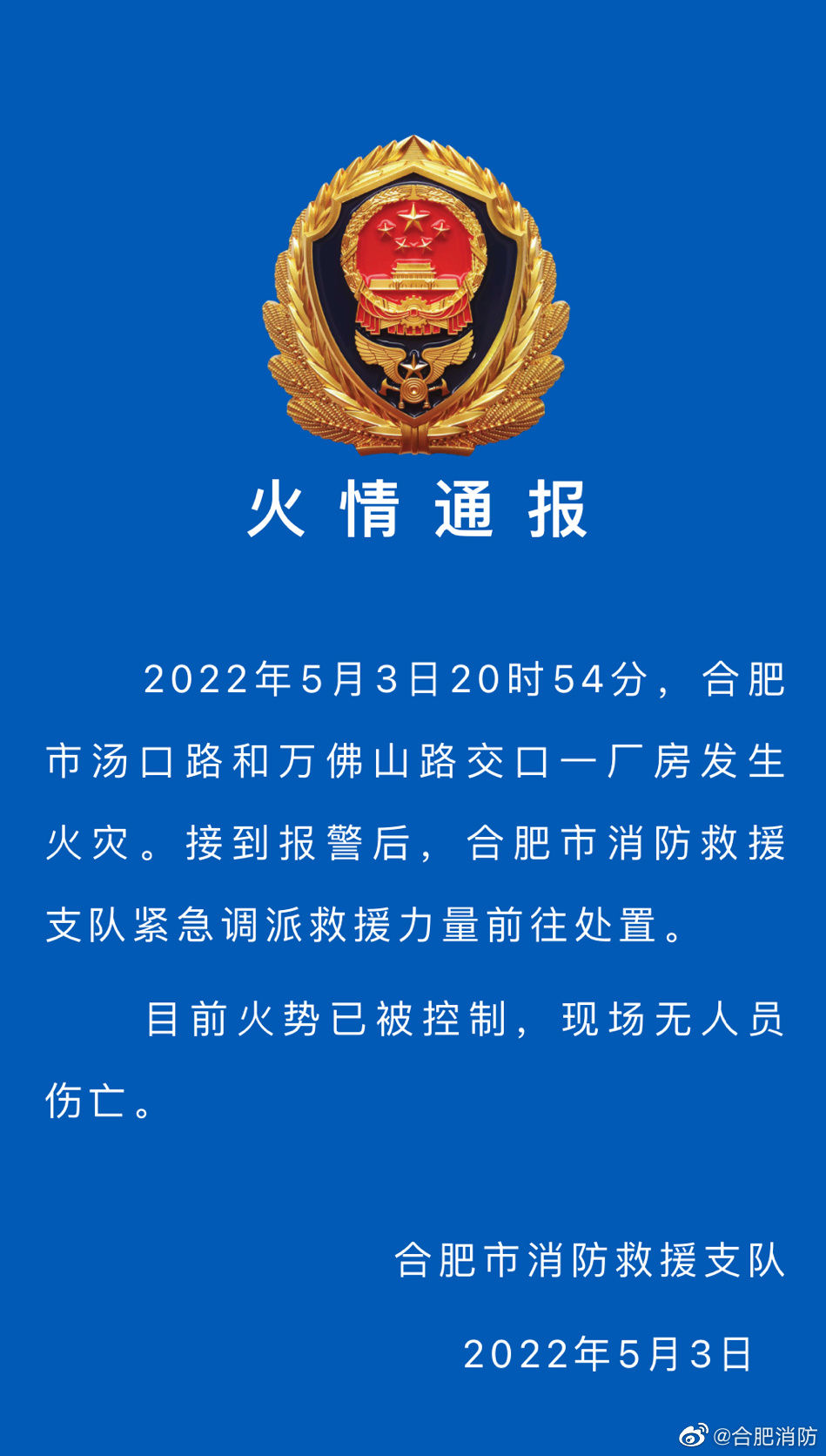荔枝新闻讯 根据安徽合肥市消防部门的通报,2022年5月3日20时54分,合肥市汤口路和万佛山路交口一厂房发生火灾。接到报警后,合肥市消防救援支队紧急调派救援力量前往处置。