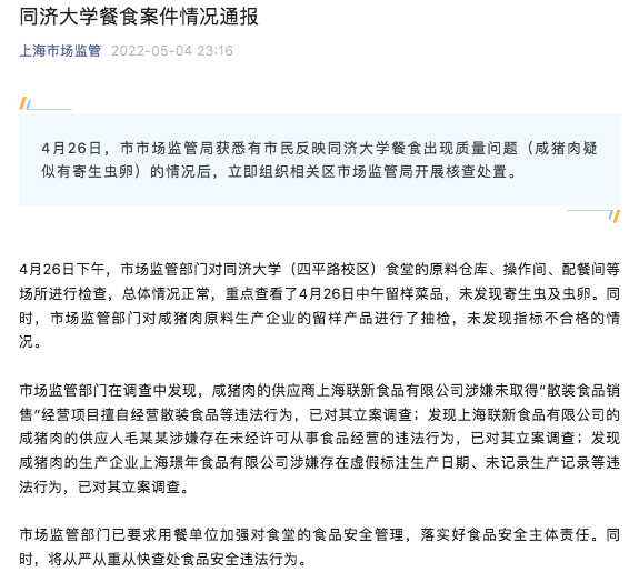 4月26日,市市场监管局获悉有市民反映同济大学餐食出现质量问题(咸猪肉疑似有寄生虫卵)的情况后,立即组织相关区市场监管局开展核查处置。