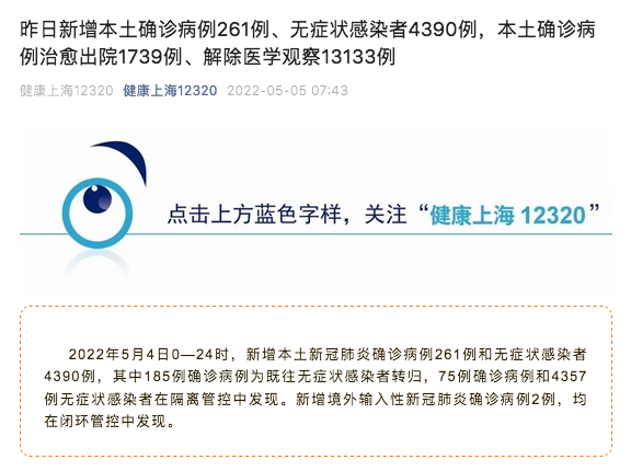 荔枝新闻讯 据“健康上海12320”微信公众号消息,上海市卫健委今早(5日)通报:2022年5月4日0—24时,上海新增本土新冠肺炎确诊病例261例和无症状感染者4390例,其中185例确诊病例为既往无症状感染者转归,75例确诊病例和4357例无症状感染者在隔离管控中发现。新增境外输入新冠肺炎确诊病例2例,均在闭环管控中发现。