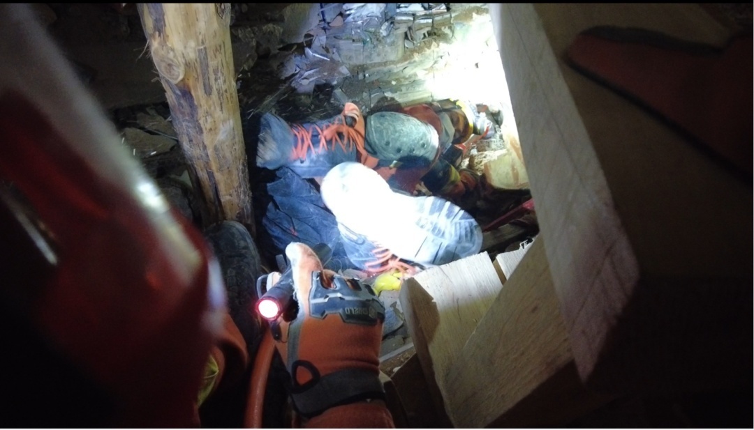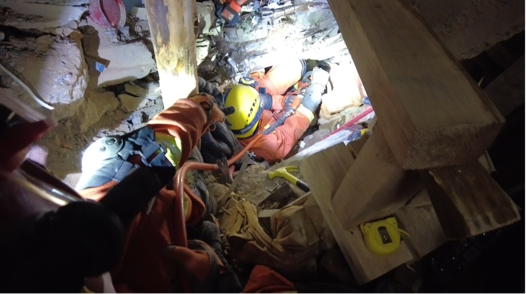 在营救6号被困者时,一阵清晰的敲击声从狭窄的救援通道中传来。于是,同步快速确认、锁定方位和部署营救计划。
