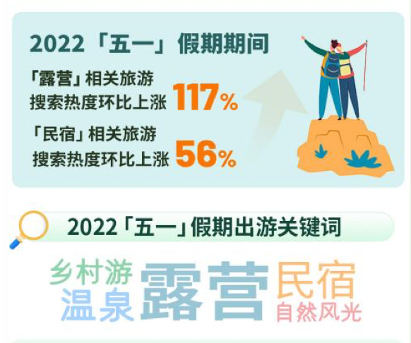 露营火爆“出圈”,同程旅行大数据显示,“五一”假期 “露营”相关旅游搜索热度环比上涨117%。公园露营、星空露营和亲子露营等成为最受关注的露营主题。江苏省内部分城市的露营地、房车营地等人气大增,城市周边的精品民宿和乡村民宿也受到消费者关注,主要城市的近郊民宿、各类度假酒店、露营地、郊野公园等人气较高的地方,出现“一房难求”、“一位难求”的情况,为丰富消费者的游玩体验,部分民宿推出了采摘、钓鱼、亲子活动等体验型项目。