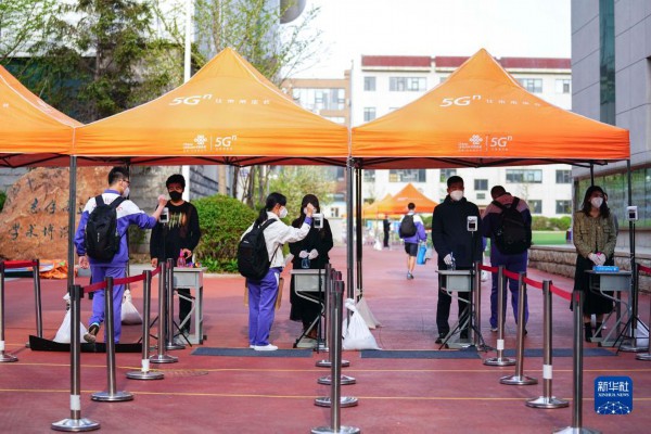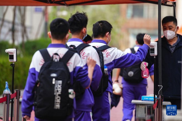 5月5日,东北师范大学附属中学高三年级的学生测量体温后进入校园。新华社记者 许畅 摄