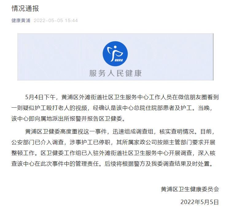 5月4日下午,黄浦区外滩街道社区卫生服务中心工作人员在微信朋友圈看到一则疑似护工殴打老人的视频,经确认是该中心总院住院部患者及护工。当晚,该中心即向属地派出所报警并报告区卫健委。
