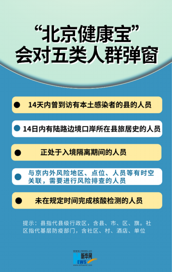 近期“北京健康宝”主要会向五类人群弹窗提示履行防疫义务