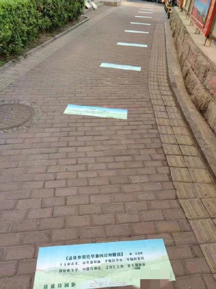 “黑发不知勤学早,白首方悔读书迟”…5日清晨,最诗意的两米间隔线出现在北京海淀莲花小区核酸检测现场。工作人员介绍,这是社区一位名叫沈俊博的高一男孩的创意,在征得社区同意后他和家人自发打印图片并粘贴在地面上。“排队的时候还能读些诗词,既起到间隔的作用,也能打发等候的时间。”(人民日报记者姜洁)