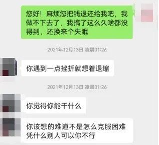 柳雪想退钱。她觉得自己不仅受了累,也没赚到什么钱,还亏了6000元,怎么看都不划算。“我一提出退费就被踢出群了,他们还说,让我有本事就去报警。”柳雪表示,对方曾多次警告她,付费行为纯属自愿,是她自己放弃,无法退款。而在付款前,双方未曾签过任何协议与合同。