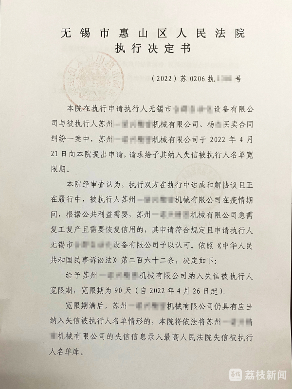 近日,无锡市惠山区人民法院作出全市首份“纳失宽限期”执行决定书,苏州某机械公司获得了90天的“纳失宽限期”。