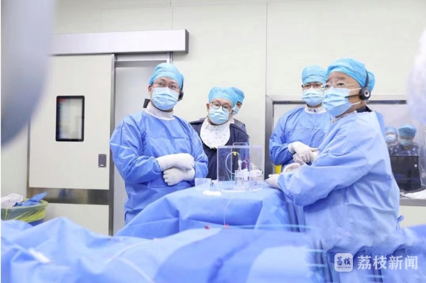 直径20-60微米的放射性树脂微球,通过精准介入被送达到直肠癌肝脏转移灶的供血血管内,近距离瞬时杀灭肿瘤细胞!这是5月5日上午8时47分,在东南大学附属中大医院完成的一例特殊的介入手术。由中国科学院院士、东南大学附属中大医院院长、介入诊疗中心主任滕皋军教授带领介入专家朱海东、张齐以及核医学科副主任刘加成等团队成员,完成国内首例钇90树脂微球技术治疗结直肠癌肝转移精准介入手术获得成功。